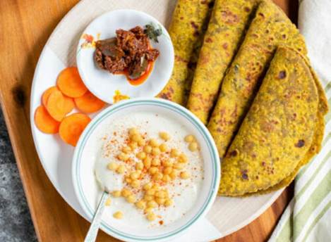 Here is a classic recipe for Gujarati Thepla served with yogurt and chutney: